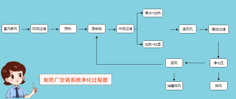 地址:上海市松江區(qū)沈磚公路5666號(hào)1幢B棟602室制藥廠生產(chǎn)中對(duì)空氣質(zhì)量要求很高,其必須設(shè)計(jì)裝修無(wú)塵凈化車(chē)間,而整個(gè)凈化系統(tǒng)中空調(diào)系統(tǒng)是重要的一個(gè)環(huán)節(jié),其凈化過(guò)程為:新風(fēng) → 初效過(guò)濾 → 預(yù)熱 → 混合段 → 中效過(guò)濾 → 加熱+加濕 → 送風(fēng)機(jī) → 高效過(guò)濾 → 凈化區(qū) → 排風(fēng)等,具體如下圖: